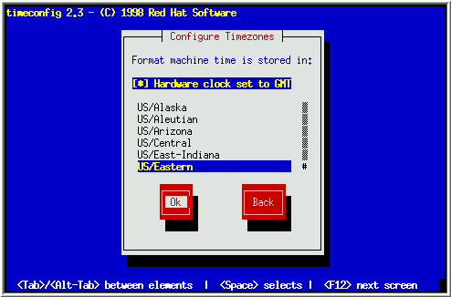 Next, the installation program presents a dialog to help you configure your Red Hat Linux system's timezone (see Figure 36).
