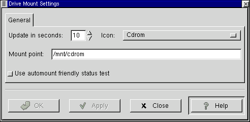 The second option you have is which icon to be displayed. You have a choice of four icons, Floppy, CD-ROM, Zip Disk, and Hard Drive. After you have selected the icon you must put the correct mount point for the drive in the Mount point text box.