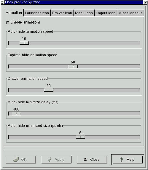 The Global Panel Configuration Dialog contains six tabs which help you configure the global properties of the GNOME Panel: Animation, Launcher Icon, Drawer Icon, Menu Icon, and Miscellaneous. Each of these tabs is explained below.