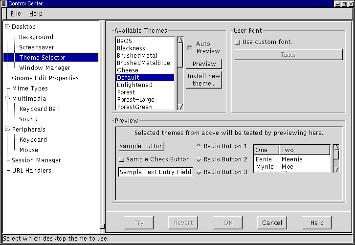 To change your GTK theme select a theme from the Available Themes list on the left side of the main workspace. If you have Auto Preview selected you will be able to see what the theme looks like in the preview window below. If you like the theme press the Try button on the bottom of the GNOME Control Center to install it.