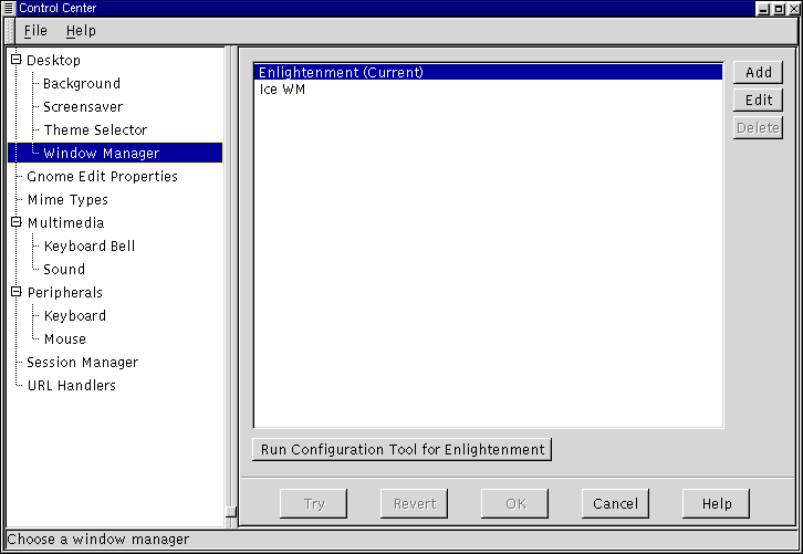 Because GNOME is not dependent on any one window manager this capplet allows you to select which window manager you wish to use. The Window Manager capplet does not determine which window managers you have available but allows you to define what, and where they are.