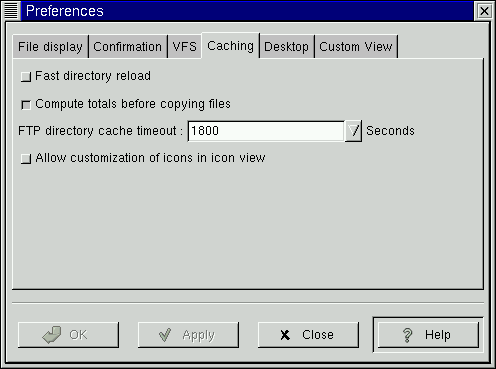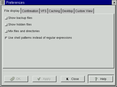 The GMC Preferences dialog is divided into Five major sections: File Display, Confirmation, VFS, Caching , Desktop, and Custom View.