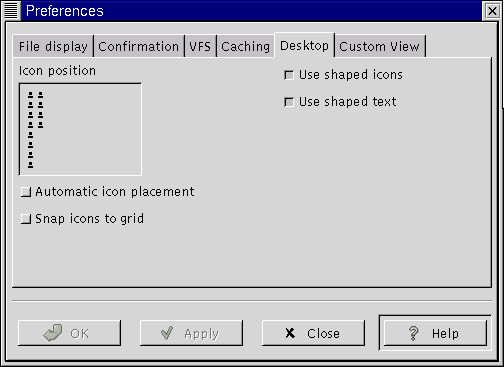 Use shaped icons - This option is turned on by default. If for some reason you have and older display, a strange X server setup, or any other graphic display problem, you may select this to make the desktop icons non-transparent.