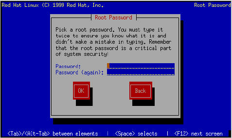 You should make the root password something you can remember, but not something that is easy for someone else to guess. Your name, your phone number, qwerty, password, root, 123456, and anteater are all examples of poor passwords. Good passwords mix numerals with upper and lower case letters and do not contain dictionary words: Aard387vark or 420BMttNT, for example. Remember that the password is case-sensitive. Write down this password and keep it in a secure place.
