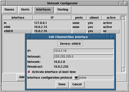 After providing the configuration information for your new device, click Done. The device should appear in your Interfaces list as an inactive device. (The active column should have a label of no.) To activate the new device, first select it with a mouse click and then choose on the Activate button. If it does not come up properly, you may need to reconfigure it by choosing Edit.