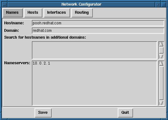 The Names panel of the Network Configuration tool serves two primary purposes: setting the hostname and domain of the computer, and determining which name server will be used to look up other hosts on the network. The Network tool is not capable of configuring a machine as a nameserver. To edit a field or add information to a field, simply click on the field with the left mouse button and type the new information.