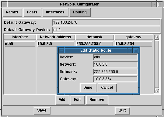 In the Routes management screen you have the ability to add, edit, or remove static networking routes. Adding or editing an entry involves identical actions, just like the Hosts panel. An edit dialog box will appear; simply type the new information and click Done when you are finished. See Figure 3-44 for an example.
