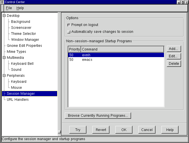 NOTE: Programs that are not GNOME compliant are not session managed so will not be restarted without being listed here. You do not need to put GNOME applications in here, you can simply leave them running and save the current session when you log out.