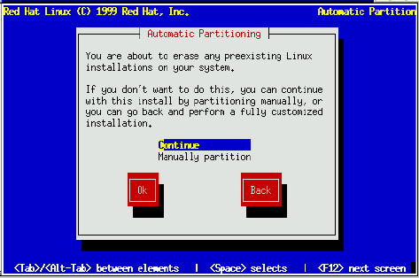 Installing Red Hat Linux over another installation of Linux (including Red Hat Linux) does not preserve any information (files or data) from the prior installation. Make sure you save any important files! If you are worried about saving the current data on your existing system (without making a backup on your own), you should consider performing an upgrade instead.
